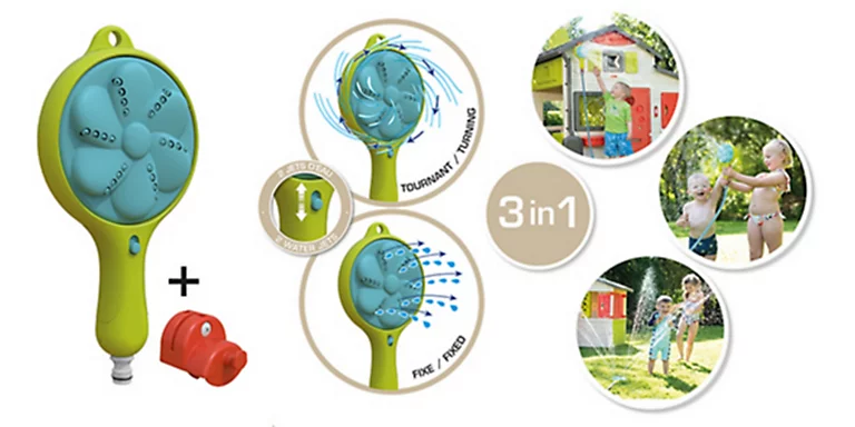 Douchette 3 en 1 pour rafraîchir les journées estivales : à poser au sol, à prendre à la main, ou à suspendre à sa maison. Avec un bouton pour choisir le jet d’eau : fixe ou tournant. Une pièce de fixation est incluse pour suspendre la douchette à sa maison (compatible avec toutes les maisons Smoby). Un raccord type Gardena permet de la relier à son tuyau d’arrosage (non inclus). A partir de 2 ans.