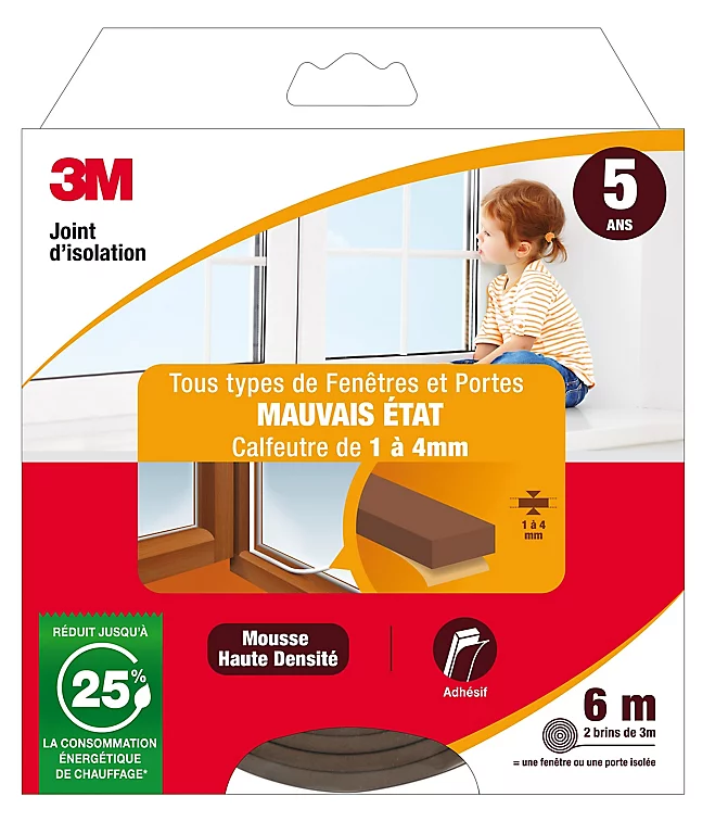 Joint mousse porte et fenêtre mauvais état 3M Classique 1 à 4 mm marron L.6 m
