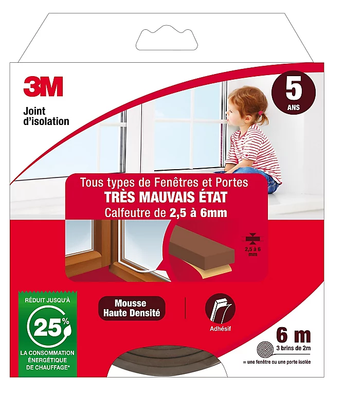 Joint mousse porte et fenêtre très mauvais état 3M Classique 2,5 à 6 mm marron L.6 m