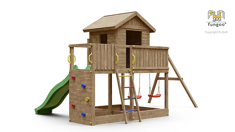 | Inclus | toboggan vert de 2,2 m + ancrages au sol + poignées+ capuchons + Maisonnette avec un toit en bois + une échelle avec des échelons métalliques + Kit bois complet + jeu de fixations métalliques + ensemble d'outils d'installation + instructions d'installation "étape par étape" avec les règles de sécurité + roches pour mur d'escalade + 2 x sièges rouge avec crochets |