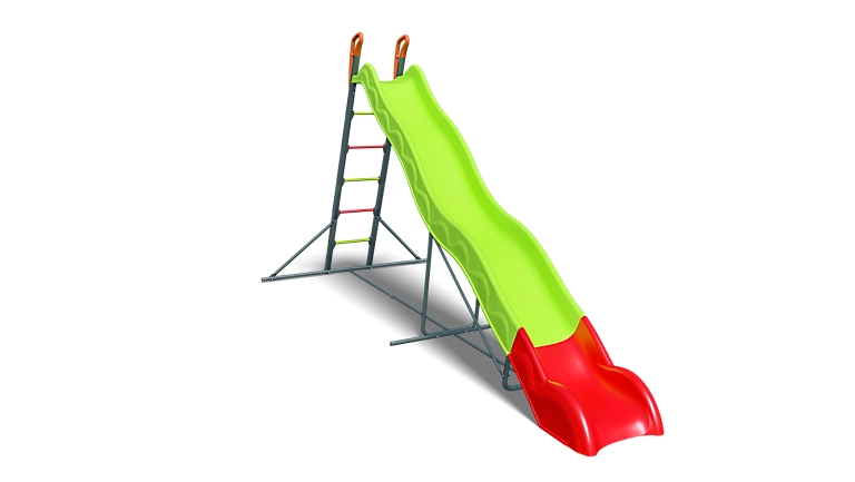 Toboggan EDGAR de 3,80m de glisse, double vague, un enfant, avec 5 marches . Glissière injectée en France, verte, structure métal coloris anthracite. Arrivée en pente douce au niveau du sol, coloris rouge. Cing échelons métal coloris rouge et vert. Mains courantes coloris rouge. Barre stabilisatrice diamètre 30mm + piquets d’ancrage . Traitement anti-UV des plastiques. Age recommandé : 3 à 12 ans . Taille hors tout : ( Lxlxh) : 422 x 148 x 205 cm.