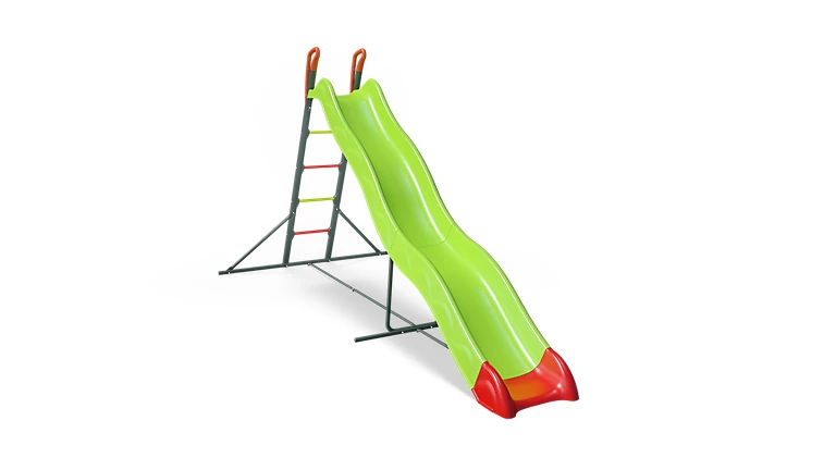 Toboggan EZAR, de 3,32m de glisse, double vague, avec quatre marches . Glissière injectée en France, verte, structure métal coloris anthracite. Arrivée en pente douce au niveau du sol coloris rouge. Mains courantes coloris rouge. Quatre échelons métal coloris rouge et vert. Barre stabilisatrice diamètre 30mm + piquets d’ancrage. Traitement anti UV des plastiques. Age recommandé : 3 à 12 ans. Taille hors tout ( Lxlxh) : 373 x 148 x 186 cm